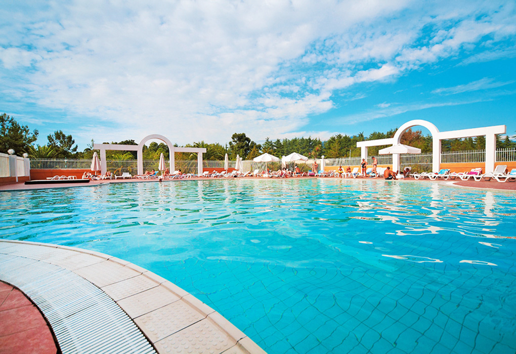 У корпуса расположен большой открытый бассейн с подогреваемой морской водой. Вокруг него установлены шезлонги, зонтики. Сам бассейн имеет очень необычную форму, территория рядом украшена белоснежными арками, создающими ощущение, что находишься где-то на греческом острове.