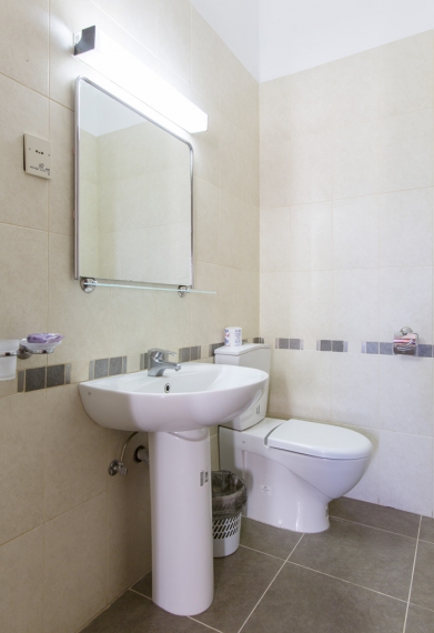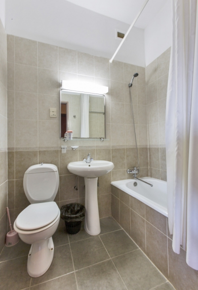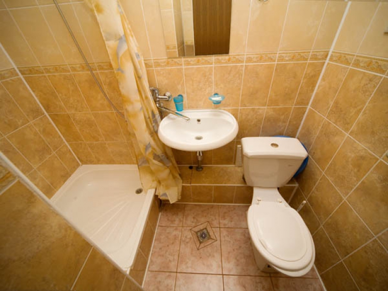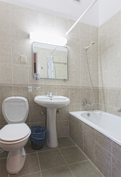 Санузел: умывальник, зеркало, унитаз, ванна или душ, фен, полотенца, туалетные принадлежности.