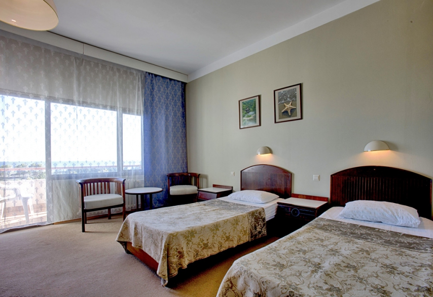 В номере: две односпальные кровати, прикроватные тумбочки, шкаф, туалетный столик, стул, журнальный столик, два кресла (не раскладываются), кондиционер, телевизор, холодильник, сейф, Wi-Fi.