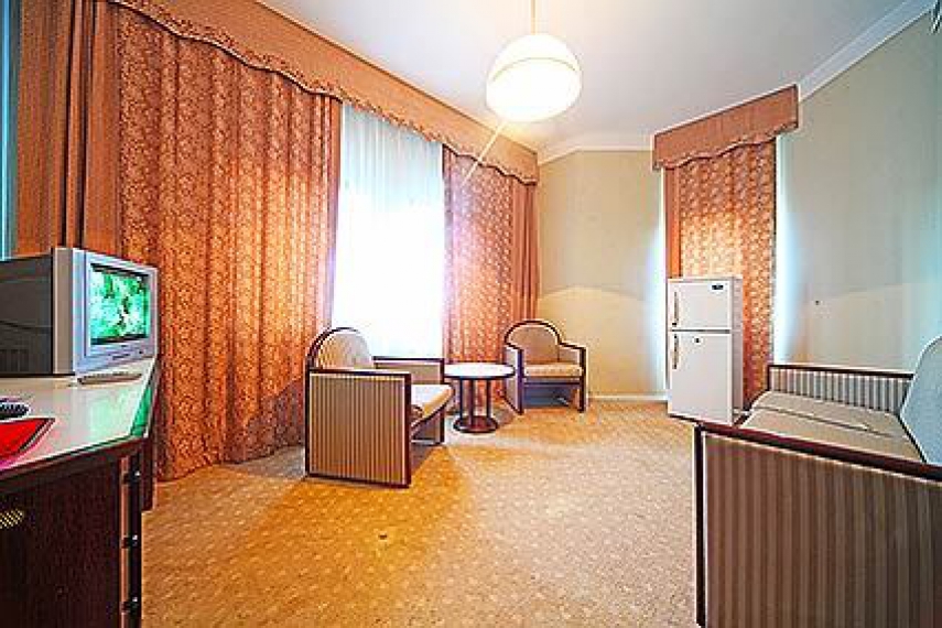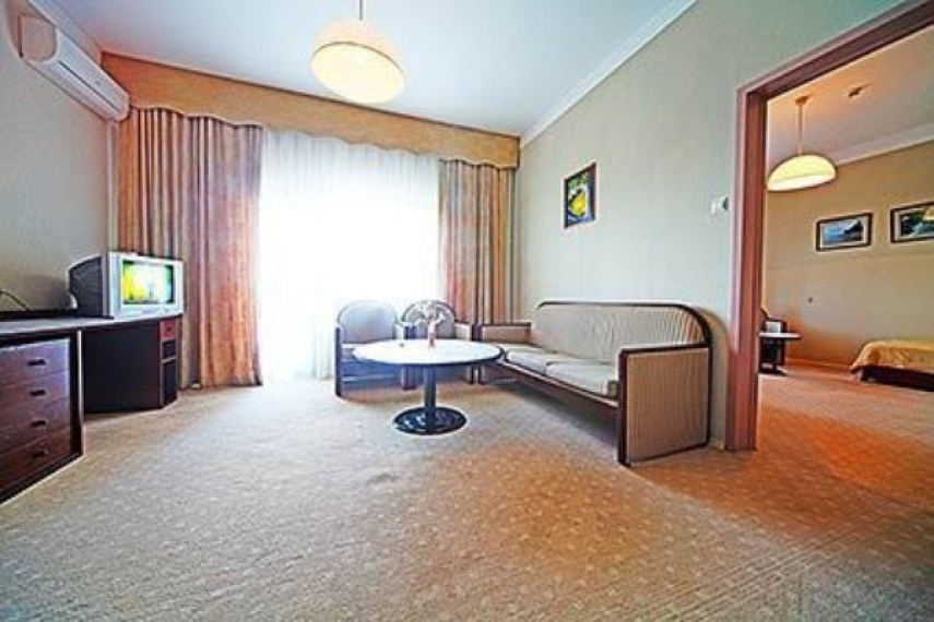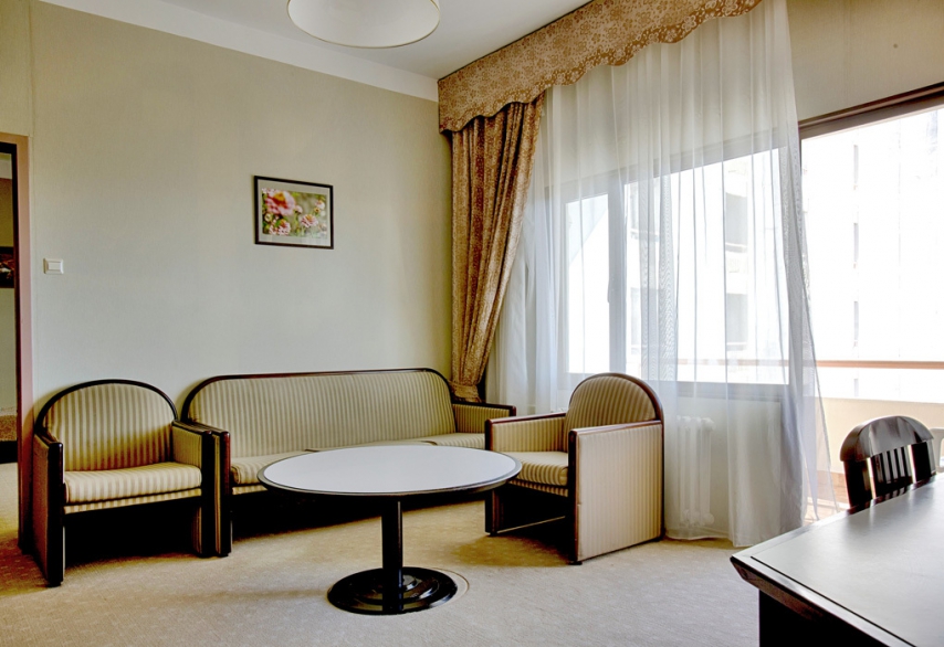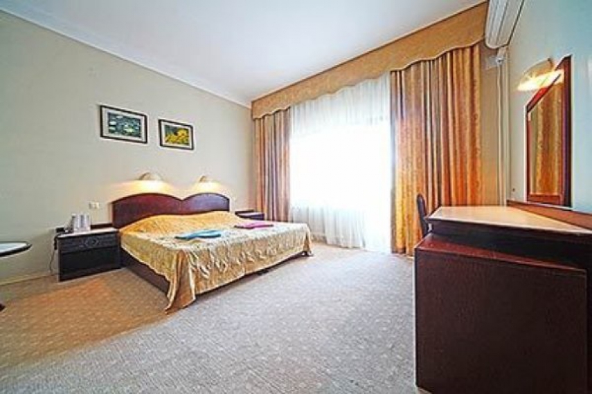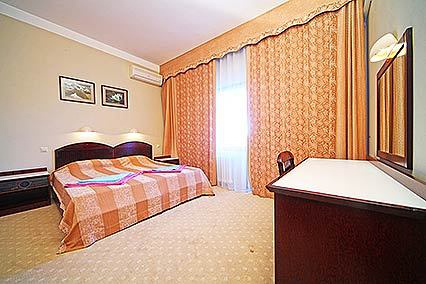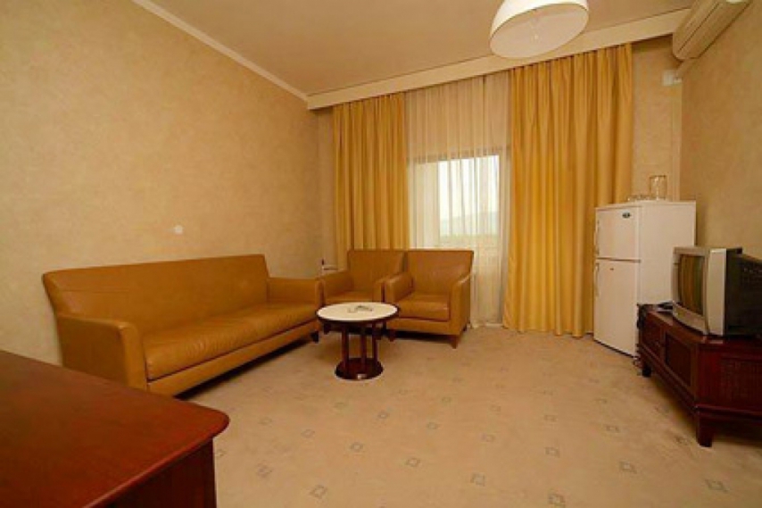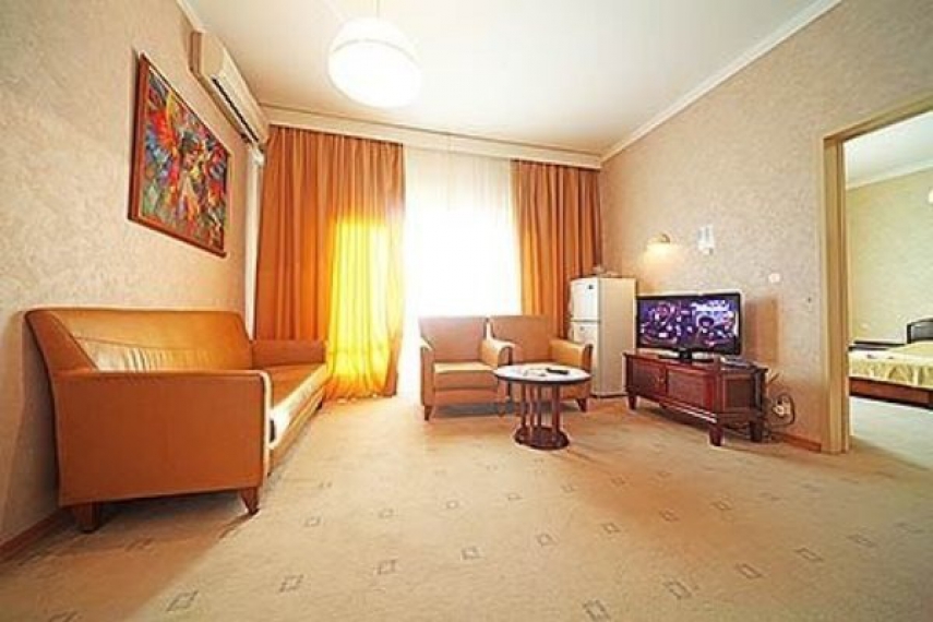 В номере: две односпальные кровати или одна двуспальная кровать, прикроватные тумбочки, шкаф, туалетный столик, стул, журнальный столик, диван и два кресла (кресла не раскладываются), кондиционер, телевизор, холодильник, телефон, сейф, Wi-Fi.