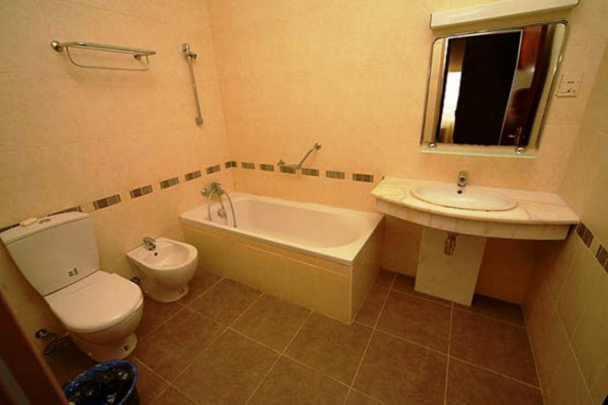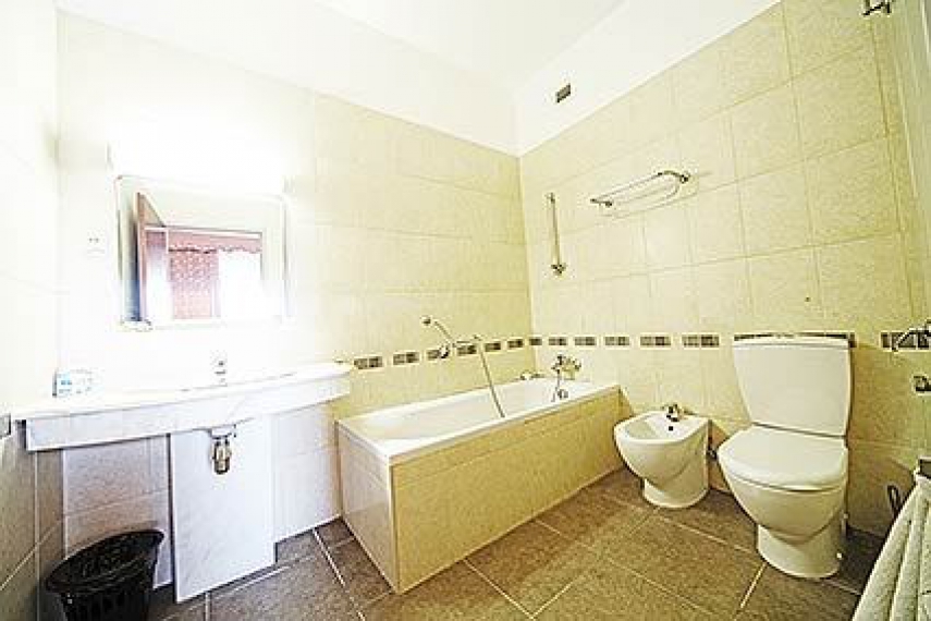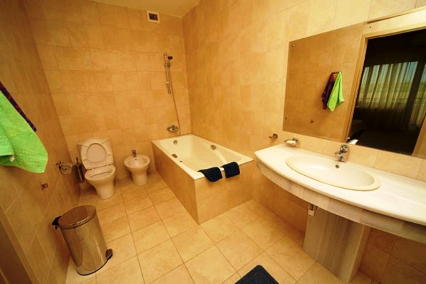 Санузел: умывальник, зеркало, унитаз, биде, ванна, фен, полотенца, туалетные принадлежности.